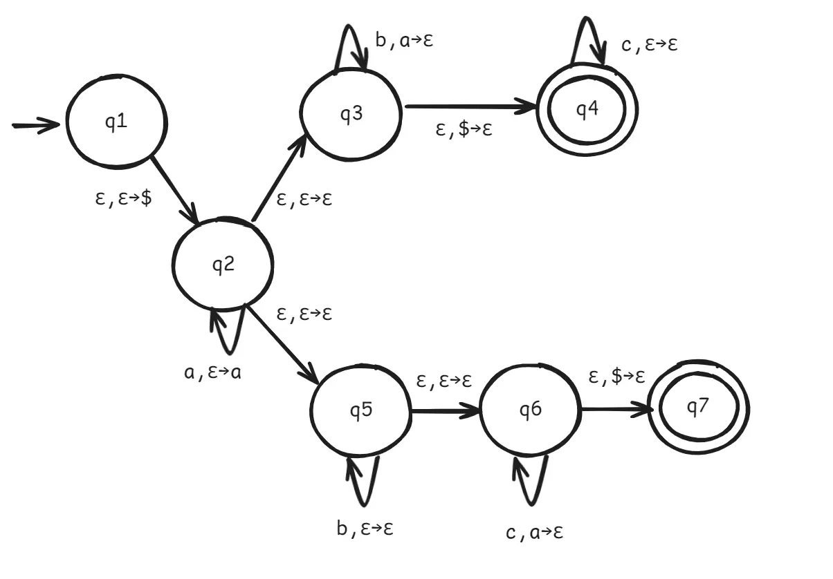 이 PDA는 q2를 기점으로 ε,ε→ε를 통해 2가지 분기로 나뉜다