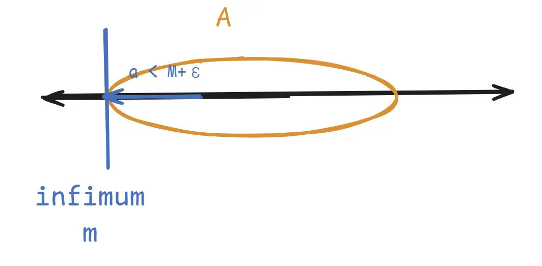 - m = 하한 $\Leftrightarrow$ 하계 m, $\forall \epsilon > 0, \ \exists a \in A,\ a<m+\epsilon$