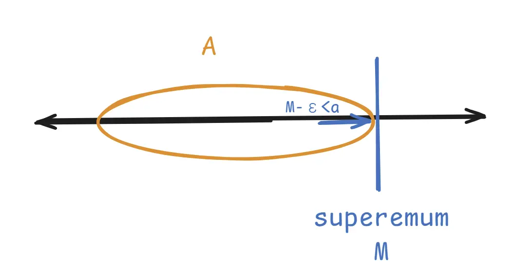 - M = 상한 $\Leftrightarrow$ 상계 M, $\forall \epsilon > 0, \ \exists a \in A,\ M-\epsilon < a$